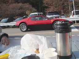 我、Aチームは駐車場入り口の近くに誘導されたので、S字コーナー出口から上り坂へと続くパフォーマンスコースのすぐ傍にテーブルを置いて観戦することができました。 この手の集まりは単に立ち話でうだうだするのが常ですが、今日は来る前にパン屋のアルピーヌさんでラスクを買って、テーブル一式を積んできたのですが、ちょっと濃いコーヒーを作ってしまい、やや失敗!。(^_^;) |