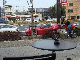 と、思ったらモトのお仲間の方のトミーカイラのZZも参加です。私達は店内でのんびりとコーヒータイムしておりましたが、路上ではZZの試乗会で盛り上がっておりました。 と、そんな時に・・・なんと今度はMVアグスタ F4-1000 AGO(?) も登場!。(大興奮) いや〜、一瞬でしたがエッジ度が高かった朝の五条通りでした。是非、またこの集団で来店して欲しいですね!。(^^ゞ |