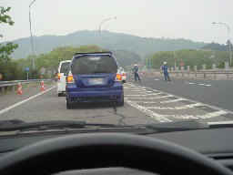 寒い箕面の山から下界の駐車場に戻り解散したのですが、直後にトラブルが再発してしまいました。今回は仕方なくJAFを呼び、待つ事約15分、意外とすぐに積車がやってきました。 とっ、これから積もうとした矢先、ちょっと間抜けな初心車マーク練習中の方が何故か積車との間に入ってきました。 オイオイ、邪魔だよ〜!。(笑) |
