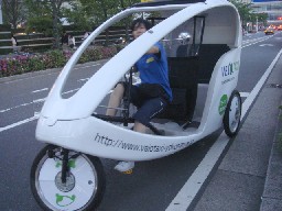 これは昨年末の事ですが京都市内のとある企業のお客さんが年末挨拶に面白いモノに乗ってやってきました。これは米製の電動スクーター「eGO」で、足元に鉛バッテリーが搭載されたものです。 フル充電で約30キロは走れるそうなので、京都市内をぐるっと走りまわるには丁度良いかもしれません。帰宅すれば、携帯電話を充電スタンドに置くように、これも充電用コードでコンセントに差すだけです。 |