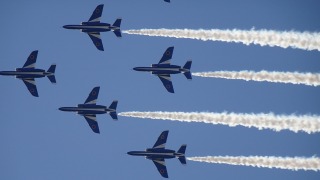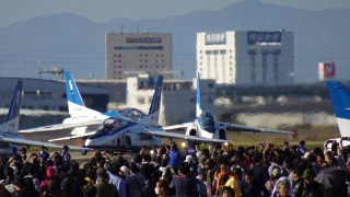 目玉はやはりブルーインパルス、コンデジのショットではこれが精一杯。各務原の基地のようにダイナミックなオープニングフライトの見せ場が少ないのが辛いとこ。それでも、ブルーが飛べば迫力満点!。 |