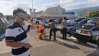 さて、最後にデロリアンEVを知ってもらうために最新のVRのデバイス?を使って、元A610オーナーのFさんにデロリアンのコックピットを観て頂きました。顔を動かした方向に車内の光景が映る・・・、実は私は酔いそうになりました。こりゃ、未来のレディ・プレイヤーワンは、私は無理だな〜。 |