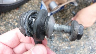 ついでにスタビライザーリンクも交換、やはりこれもラバーはちぎれて中は丸見え状態。2003年式、14万キロ走行ともなれば経年劣化は仕方ありません。消耗品と考え、早めに交換が望ましいですね。 |