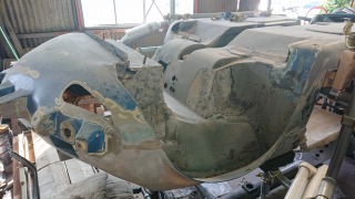 秘密基地では、FさんのA110のレストアも少しづつ・・・進行中です。画像はひっくり返されたA110のFRP製のドンガラ、真ん中の凹みのところに丸いバックボーンフレームが入るわけです。いっその事、モデルSのようなバッテリーを敷き詰めたフロアパネルを作り、リアにモーターを積んだコンパートEVにトライしたいですね。 |