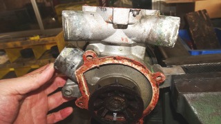取り外されたPRV Z7Uのウォーターポンプ。ベルトのプーリーを手で回すとコトコトと振動があり、上下にゆすると若干ガタガタと動き、どうやら水漏れの原因は軸の部分からのようだ。因みにポンプの交換はこれで累計3度目です。以前の白V6Tで2回、ルマンは今回が初です。 |